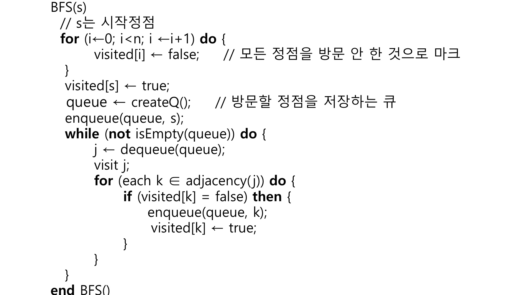 3. 큐에서 정점을 삭제하여 새로운 i를 설정하고, 단계 (1)을 수행한다.